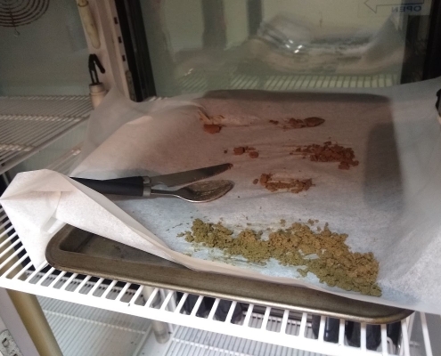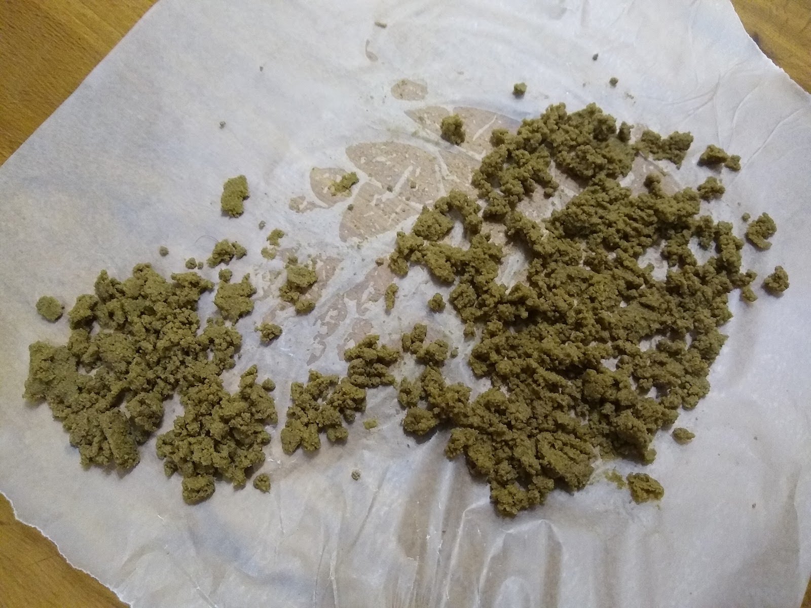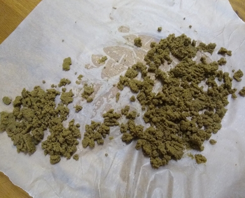 The large green plant matter is filtered out and not used. The trichomes and CBD/THC-carrying material are collected in different micron sizes and then allowed to dry slowly.