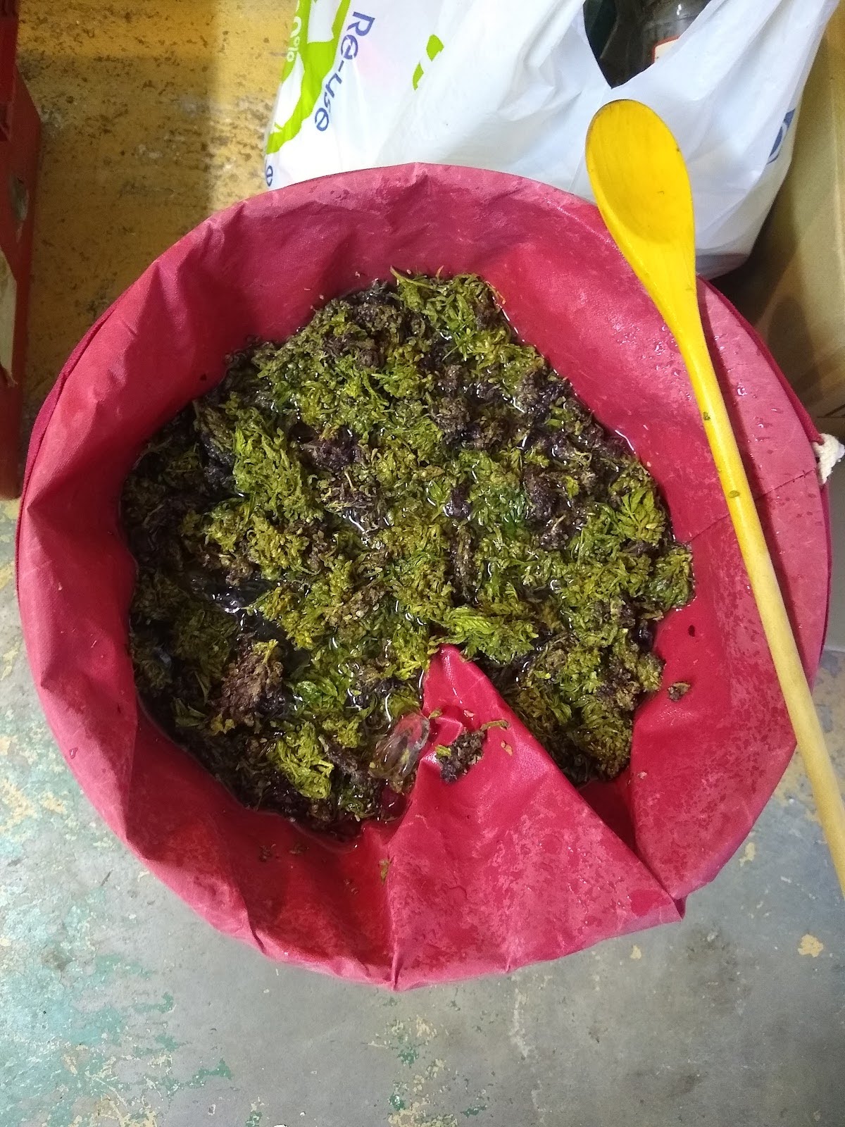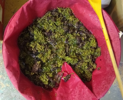 The above image shows plant material being prepared for the press. The use of a sieve bag assists the process by retaining plant material and keeping the oil clean.