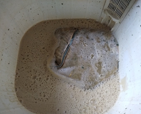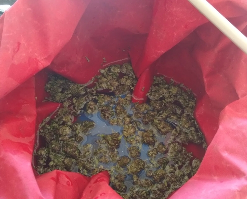 The above images show plant material in ice water soaking and being mixed to release the trichomes from the plant material.