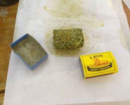 We experimented using matchboxes as pre moulds to press the flower before putting it into the bags.