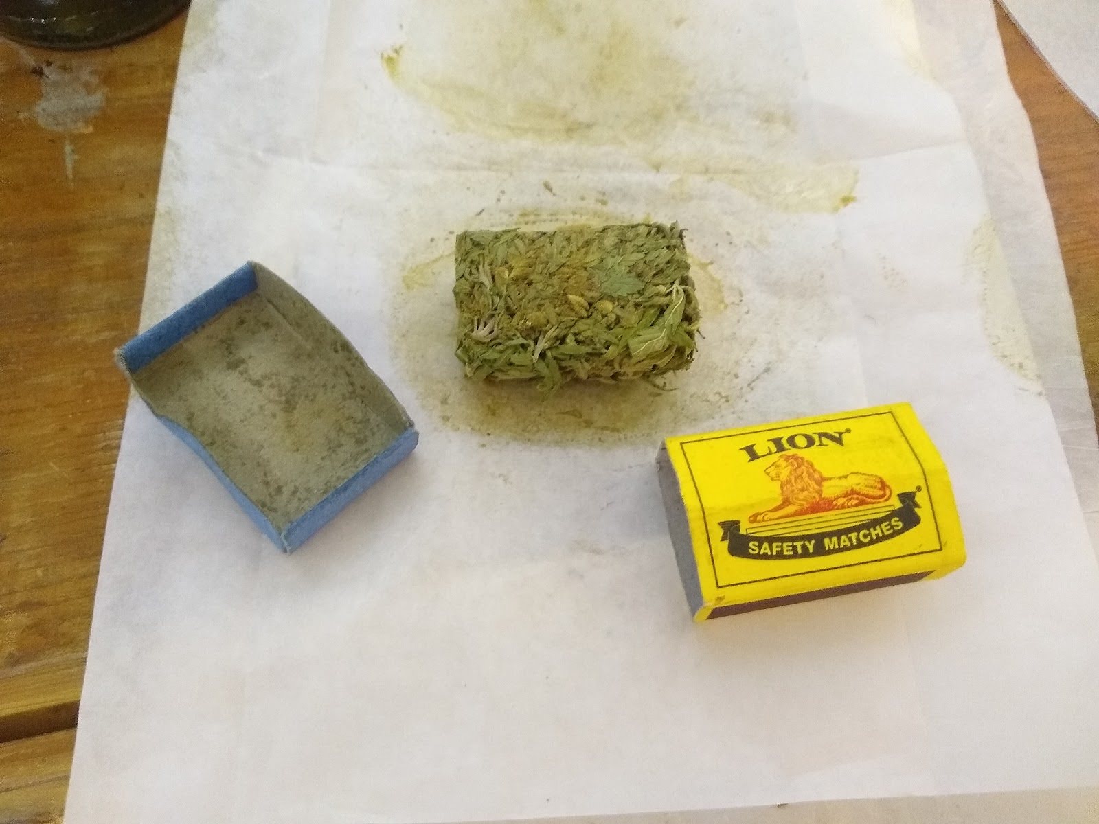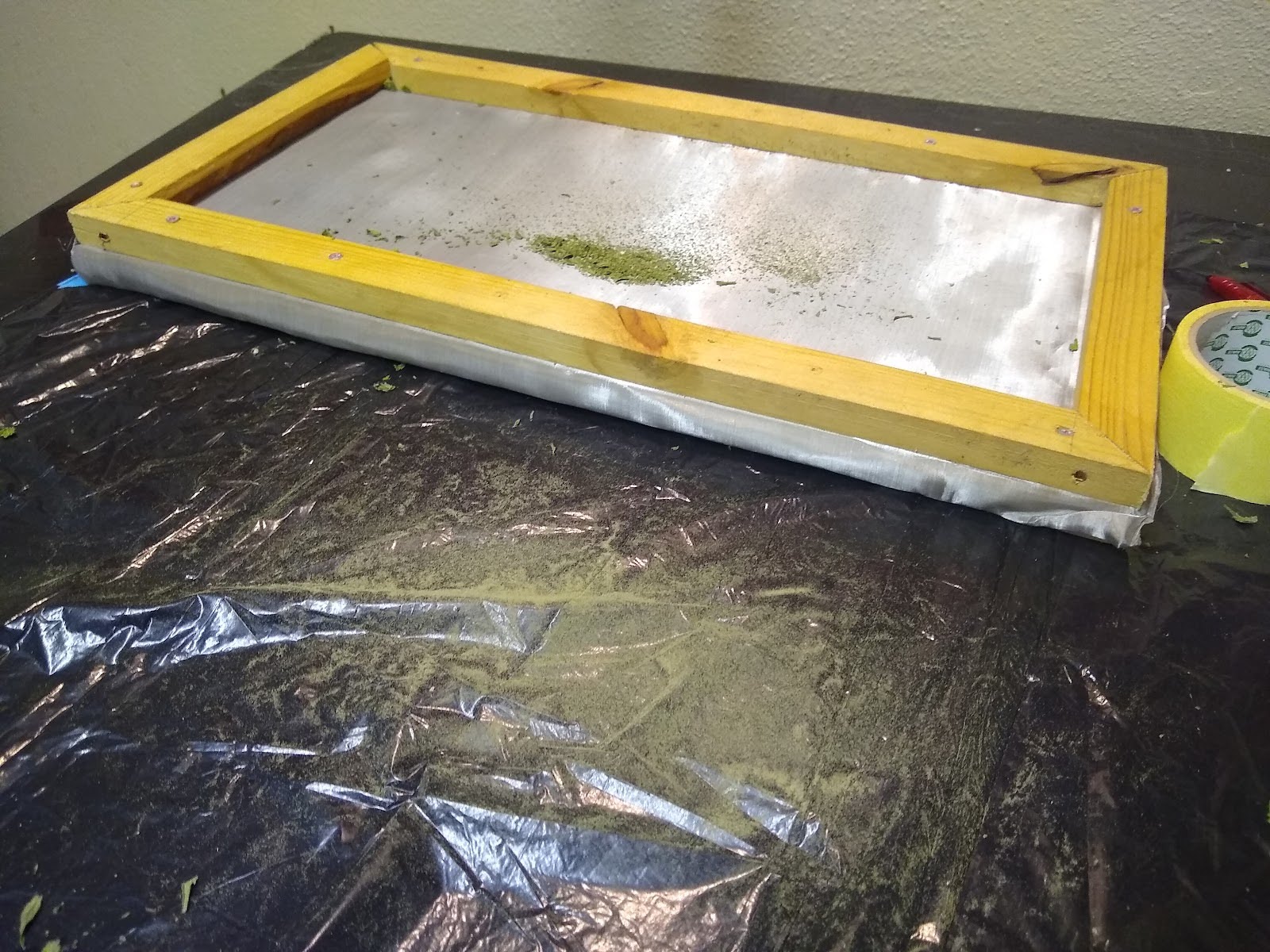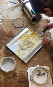 The above images show the steel screen in a wooden frame with plant material, this screen is shaken by hand and the material being collected falls through onto the table. The valuable medicine-rich dust is then scraped up and collected.