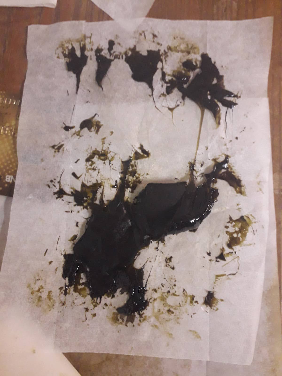 The final product as it comes out of the catchment tank is foamy and full of butane. The material will solidify as the butane evaporates leaving a yellow honeycomb of a sticky oily type of material.