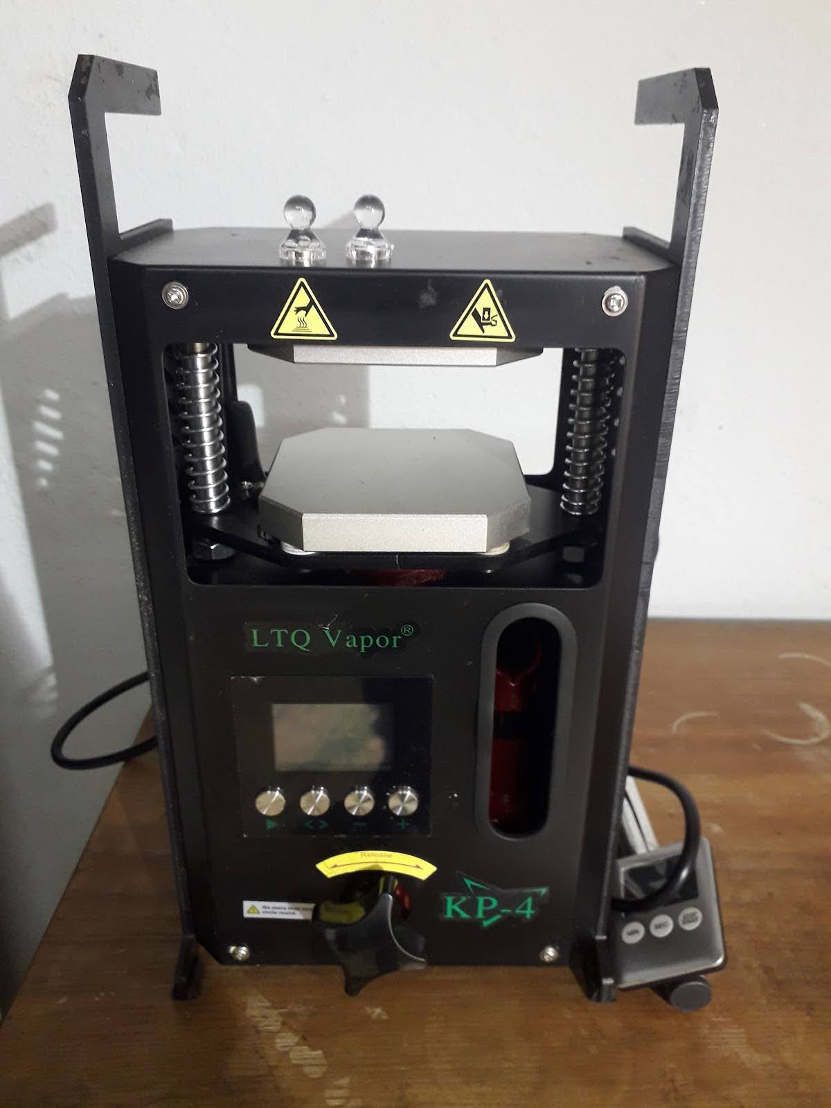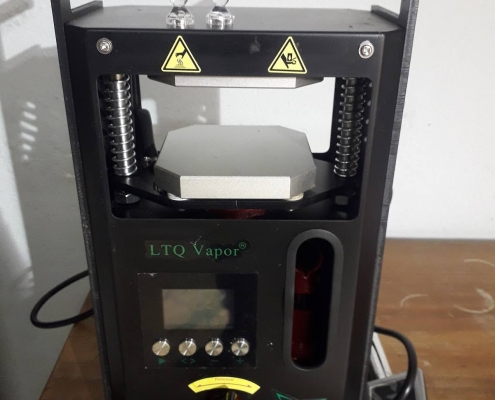 The heated press is a set of plates with heating elements inside and a hydraulic jack attached to apply pressure to the material and squeeze out the valuable cannabinoid carrying oil known as rosin. The unit used is very small and not for commercial use but perfect for demonstration (Pictured below).