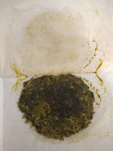 The above image shows dried material compressed into a hard ball for ease of storage, the process requires small amounts of heat and pressure to melt the material enough to stick together.